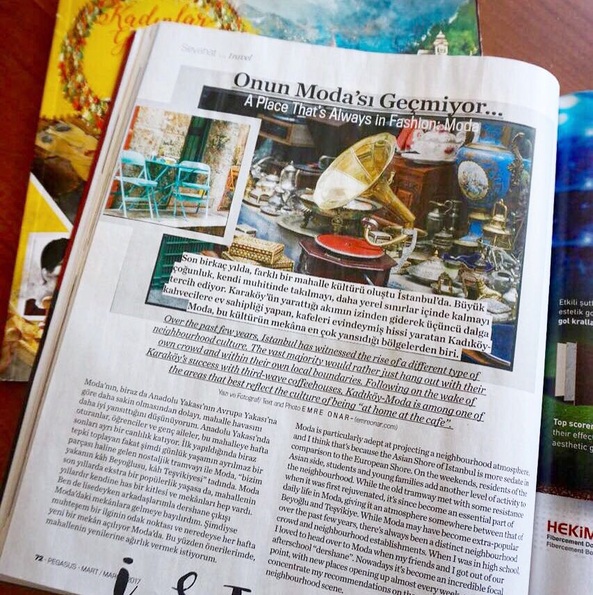 Bu ay Pegasus ile uçuşunuz varsa yolculuğunuz sırasında benim yazımı da okuyabilirsiniz! Pegasus Dergisi’nin Mart sayısında Moda’nın mahalle kültürünü ve oradan kafe önerilerimi paylaştım! Blogumu bulup, yazılarımı beğenen ve benimle iletişime geçen Merve Yeniev’e çok teşekkürler.