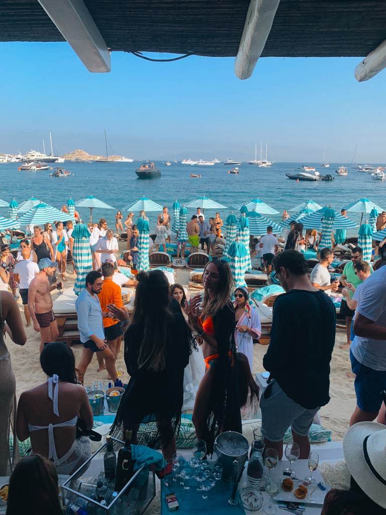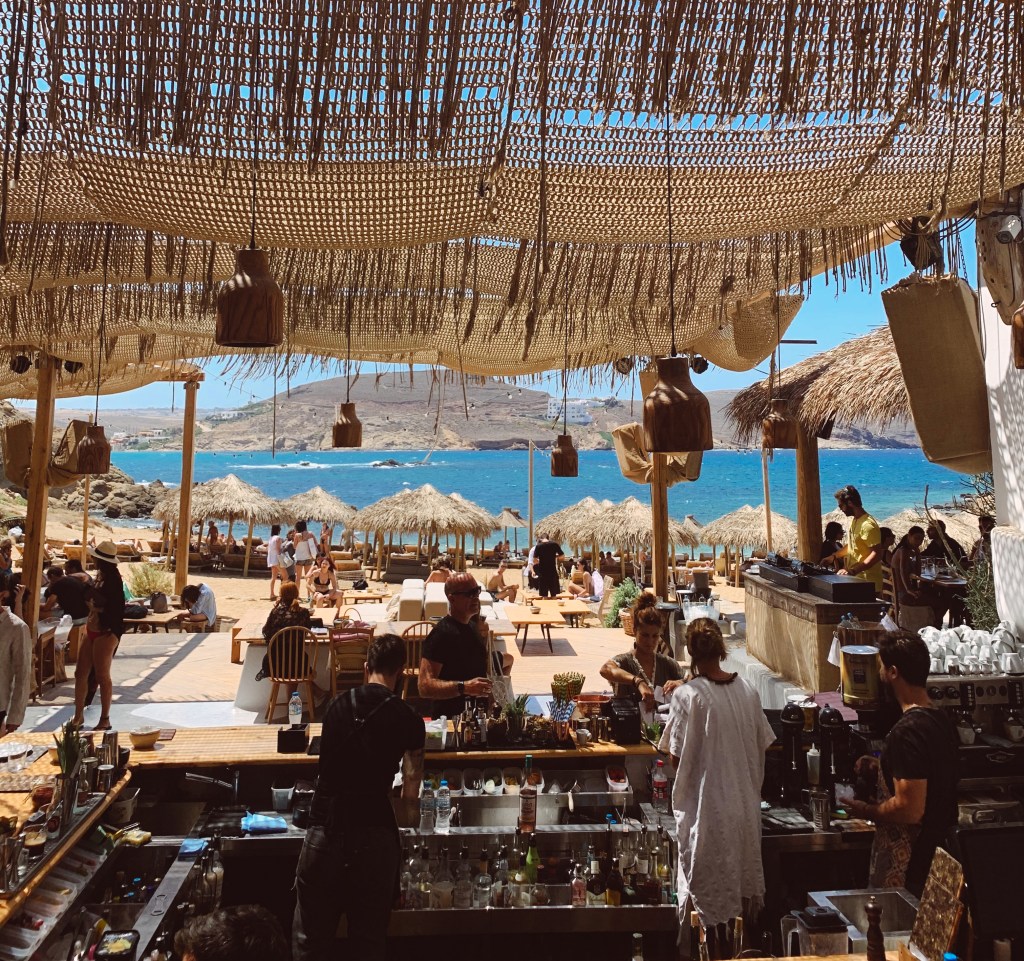Rezervasyon yapmadan öğlen 2 gibi gittik ve bol bol şezlong vardı. Deniz kıyısındaki şezlonglar 80 Euro’dan başlıyor, en arkada sırada ise kişi başı 20 Euro’ya kadar düşüyor. Mikonos için daha uygun fiyatlar diyebilirim yani.