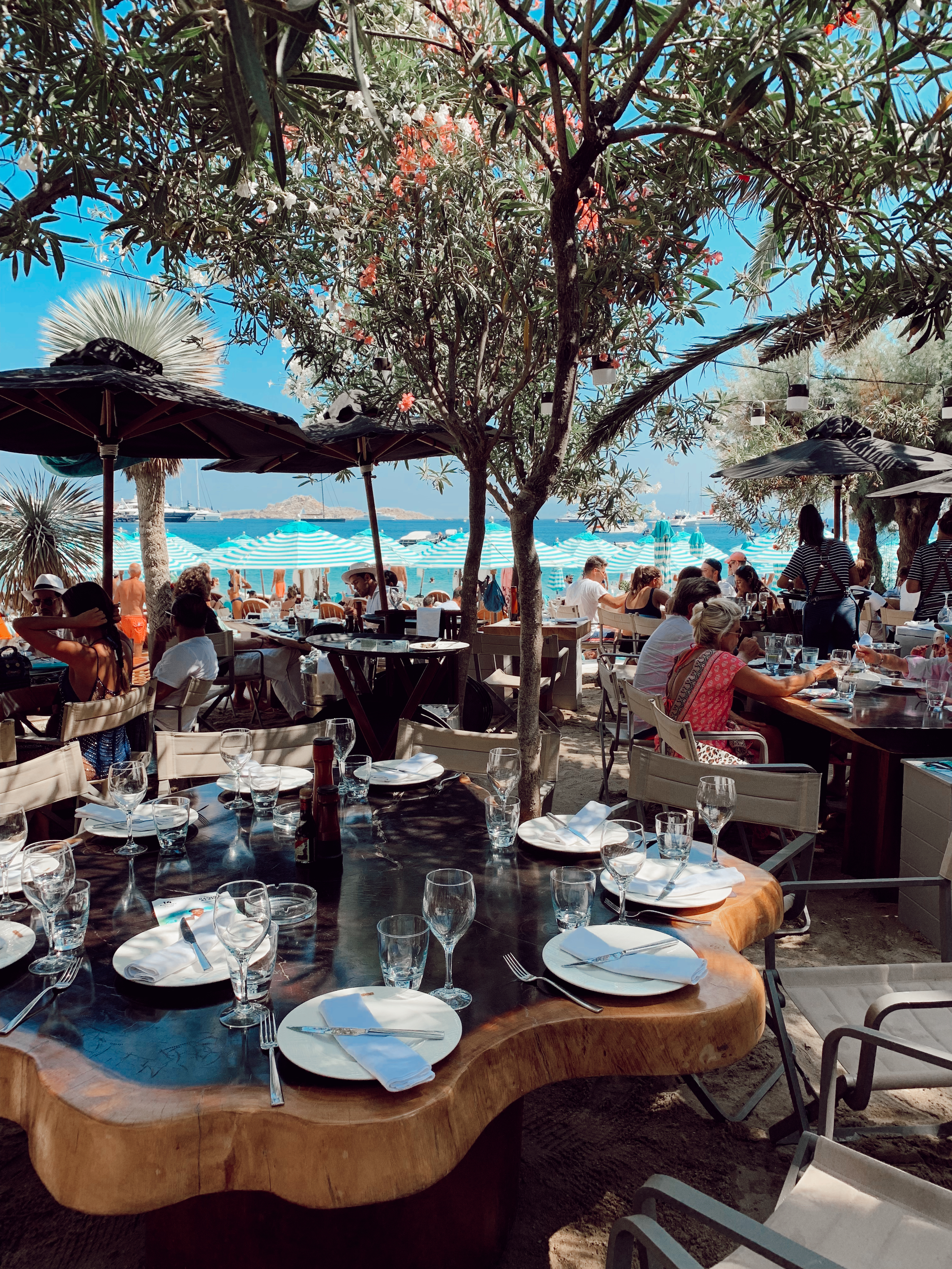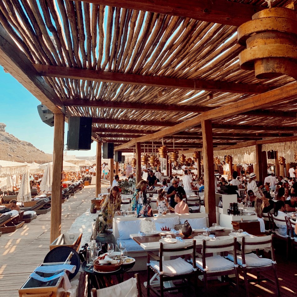 Nammos, 2003’te açılıp adanın en ünlü beach club’larından biri olmuş. Sosyal medyadan gördüğüm kadarıyla bana burası biraz “görgüsüz zengin ve eskort mekanı” gibi geliyordu. Belki 2000’lerin ortasında çok güzeldir de sonradan bozmuştur gibi düşünüyordum, ama arkadaşlarımdan “en eğlendiğim yer Nammos oldu” tarzında yorumlar alınca burayı da programa ekledim. İlk gün yorgun olacağımız için hiç sabahtan plaja koşturmayalım dedik ve buraya doğrudan öğlen yemeğine gittik. Saat 4 gibi öğle yemeği rezervasyonu yapmak ideal, çünkü saat 5 gibi hareketlenmeye başlıyor ve 6 gibi herkes ayaklara kalkıyor.