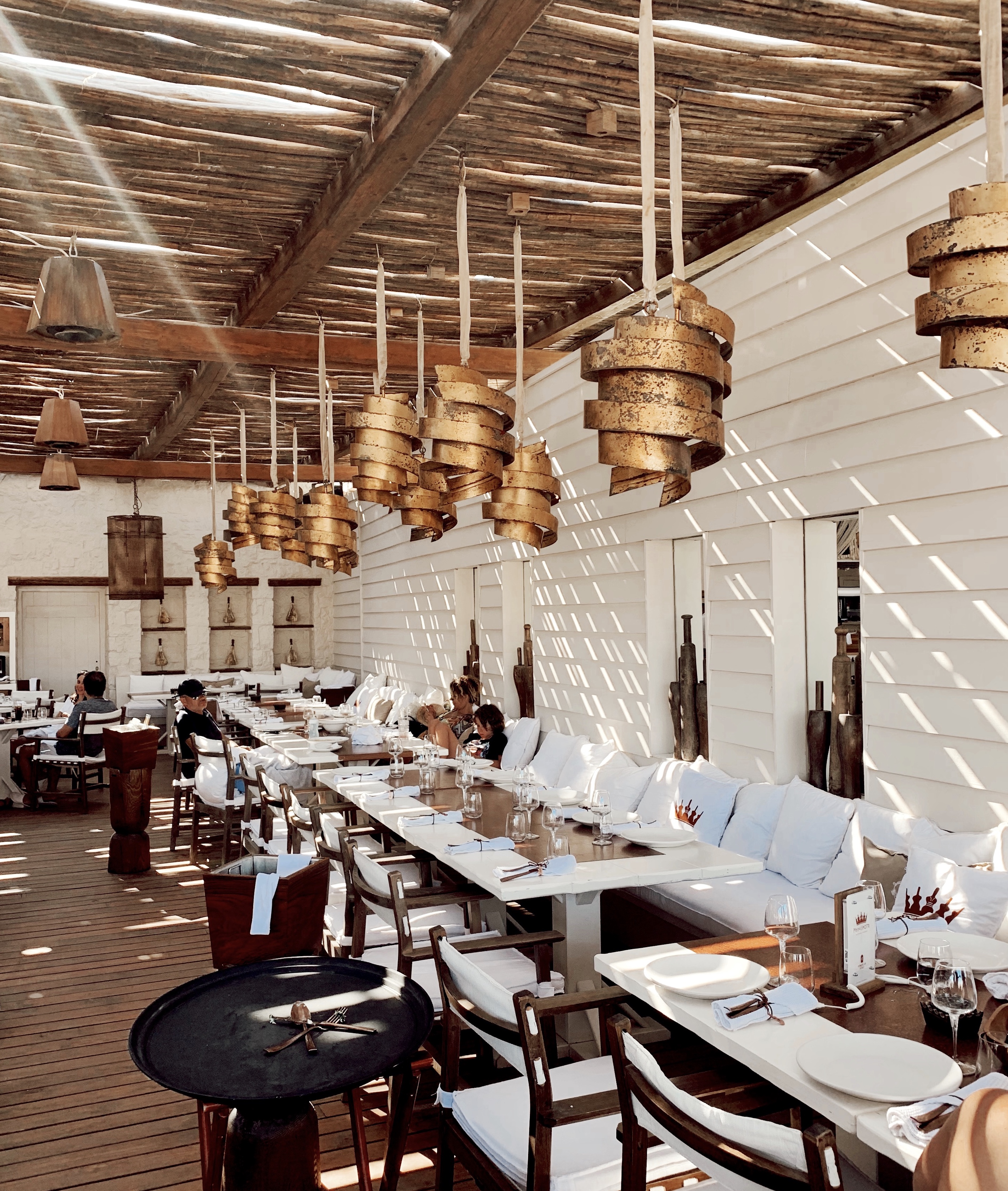 Yemek pahalı olsa da içki fiyatları Mikonos ortalamasına göre makuldü. Şişe şaraplar 30 Euro’dan başlıyor, gerisi için “sky is the limit”. Burada da Nammos ve Spilia’da olduğu gibi bir süre sonra müziğin sesi yükselmeye başlıyor ve herkes sandalyelere çıkıyor. Saat 6 gibi masada oturmayan kimse kalmıyor!